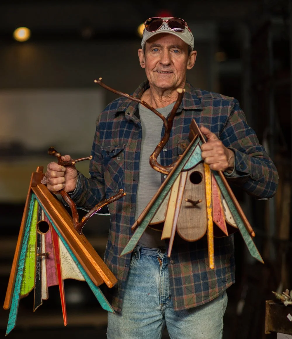 Ken Wheeler is a Saluda, North Carolina–based woodworker who creates one-of-a-kind birdhouses and furniture from reclaimed wood. A longtime “green” artist, he transforms locally sourced materials into pieces that are both beautiful and functional.